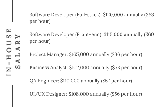 In order to analyze the costs that you save on outsourcing MVP development, it is crucial that you know how much you’d have to pay if you choose to build your minimum viable product in-house. This section will highlight the major costs that come with in-house development.